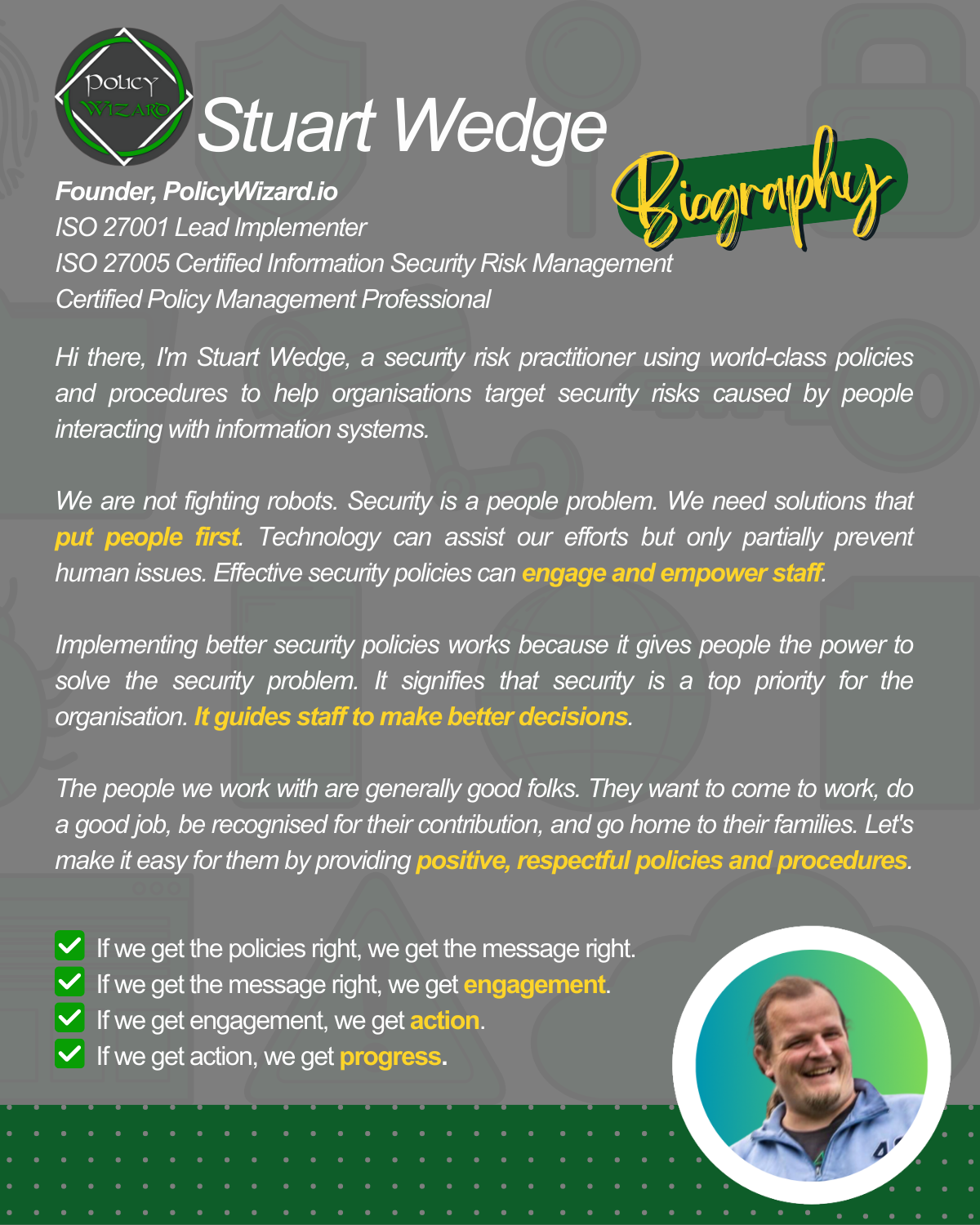 The Information Security Policy Writer course can teach you this in only four hours. To prove your knowledge, use the Side Quests you created in the practical labs.